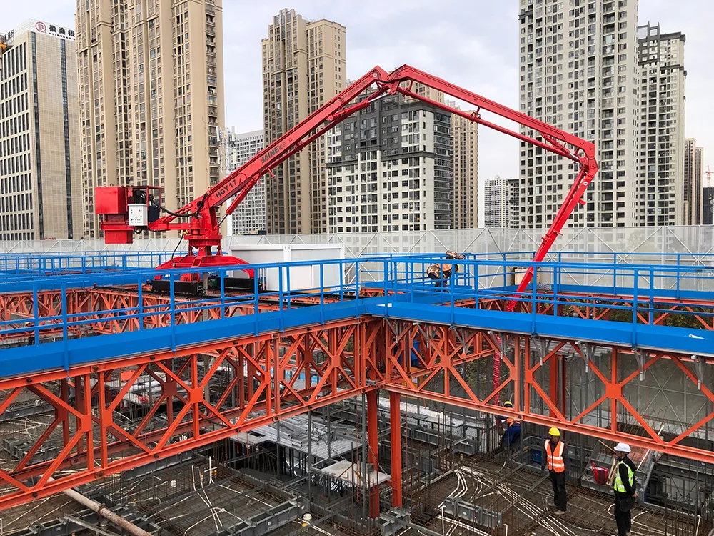 造樓機專用混凝土布料機讓造樓機在現場諸多受限條件的基礎上,無論是在安裝空間上,還是在澆筑范圍上,都有了更多的選擇;再配上智能操控方式,讓混凝土澆筑變得更加簡單、便捷。